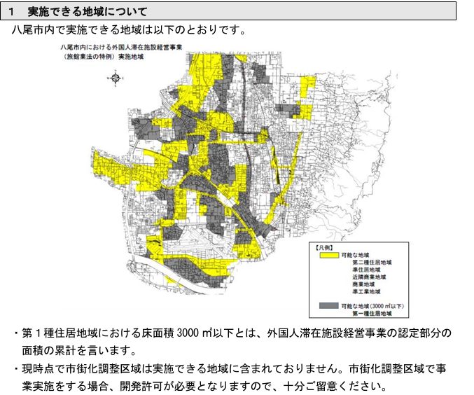 八尾市では市街化区域のうちホテル・旅館の建築が可能な地域(第1種住居地域にあっては床面積3000平方メートル以下において実施)で申請が可能です。