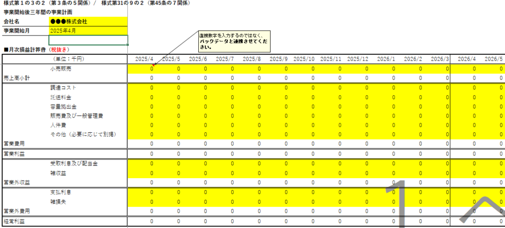 PL・損益計算書として、以下の様なエクセル資料を元に計画を作成します。こちらは、手入力ではなく後述するバックデータへ入力するとこちらに反映するリンクとなっています。