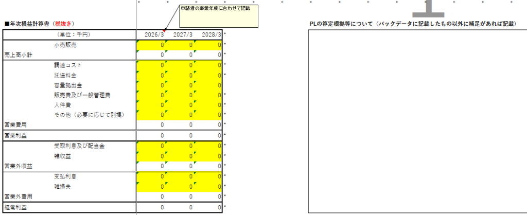 しかし、審査の中心となる計画数値ですので、しっかりと将来の見通しなども検討しながら入力を進めましょう。