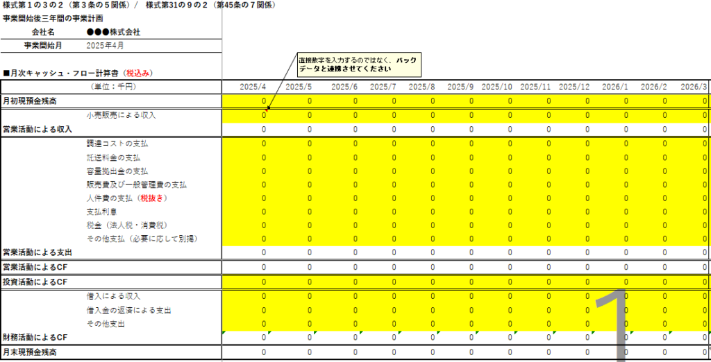 CS・キャッシュ・フロー計算書計画についても同様のエクセルに記載します。こちらも、バックデータに入力し自動反映されます。