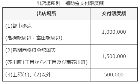 なお、出店場所によって補助金の交付限度額が変わります。以下、補助金の内容をご確認ください。